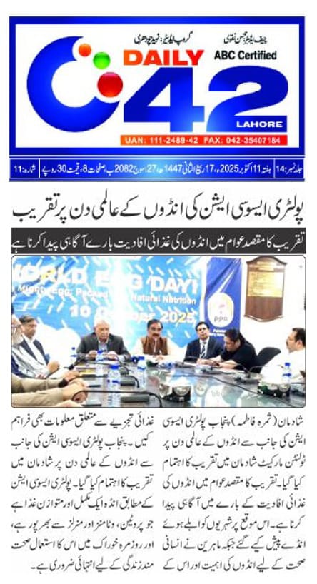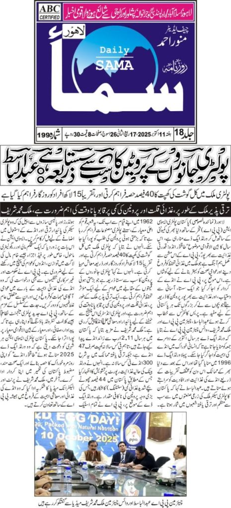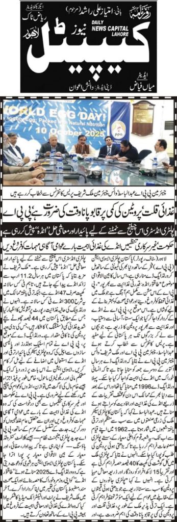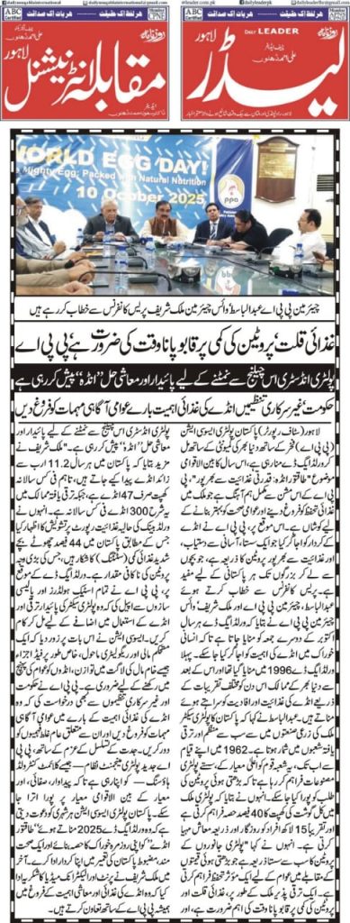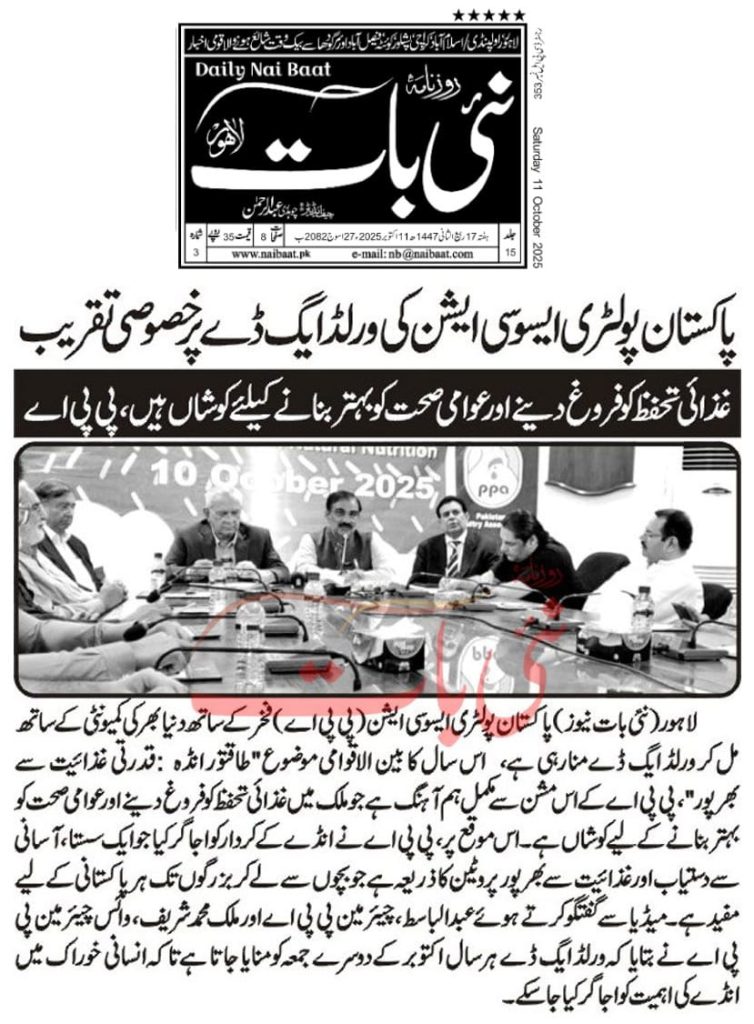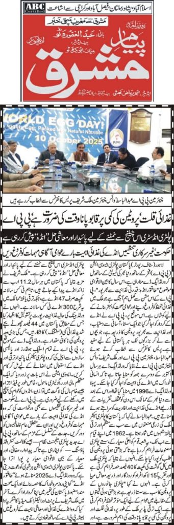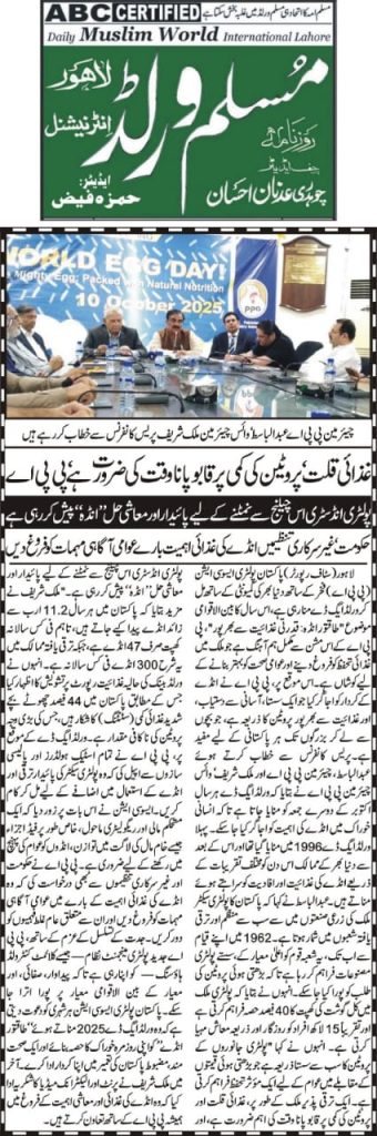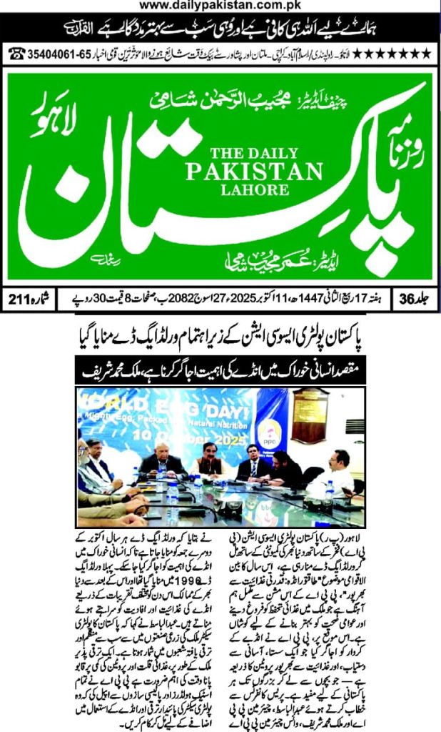 On World Egg Day, the Pakistan Poultry Association (PPA) organized a press briefing at 24-R Poultry House, Johar Town, Lahore, attended by Chairman Mr. Abdul Basit, Vice Chairman (NR) Mr. Malik Muhammad Sharif, and other key members of the association. Addressing the media, Mr. Basit highlighted that World Egg Day, first celebrated in 1996 and observed annually on the second Friday of October, is marked globally to recognize the importance of eggs in the human diet. He emphasized that eggs are an affordable and high-quality source of protein, playing a vital role in global nutrition across both developed and developing countries. He further noted that Pakistan’s poultry sector, one of the most organized segments of the agro-based industry, has been serving the nation since 1962 by providing cost-effective poultry products to meet the growing demand for animal protein, thereby contributing significantly to both public health and the country’s economy.